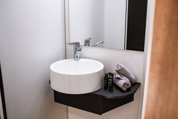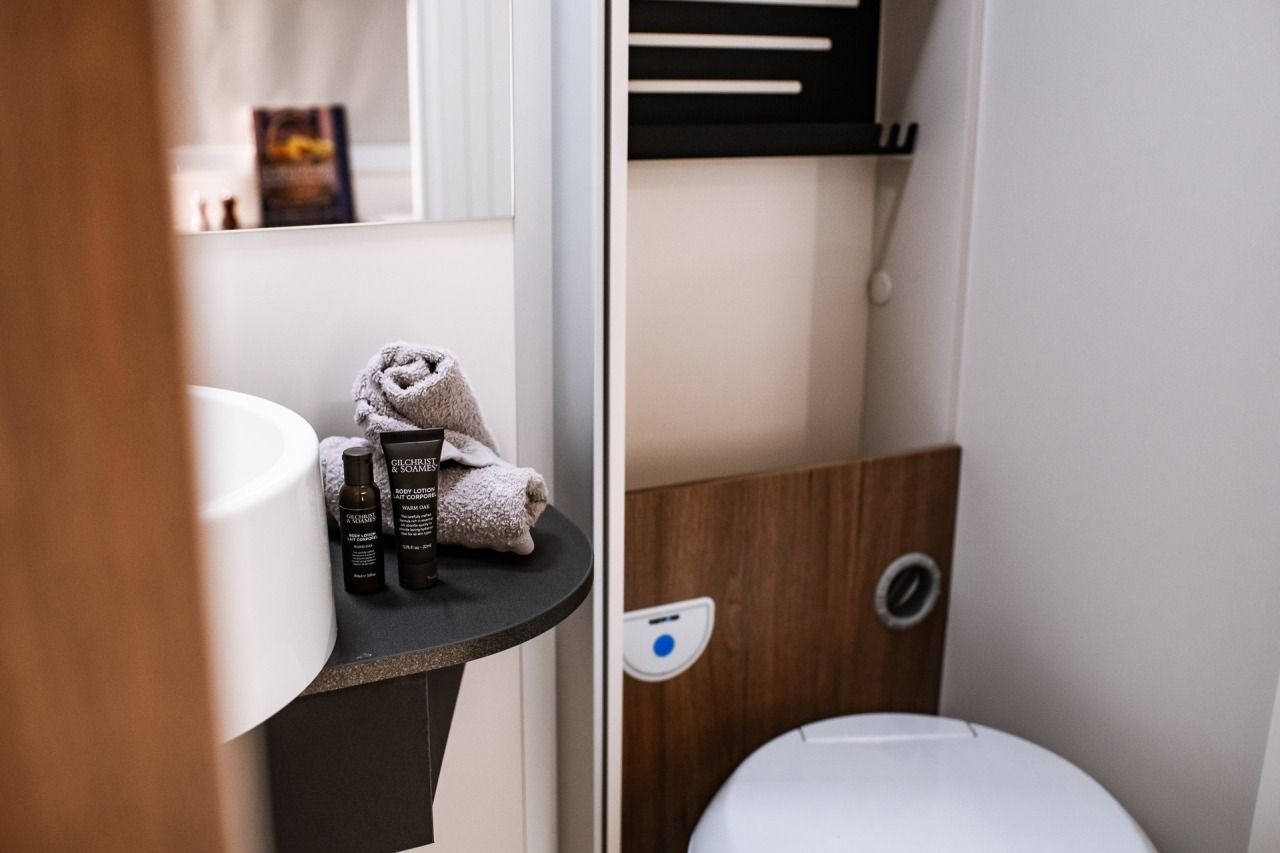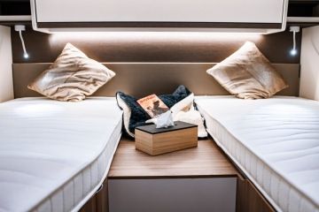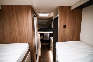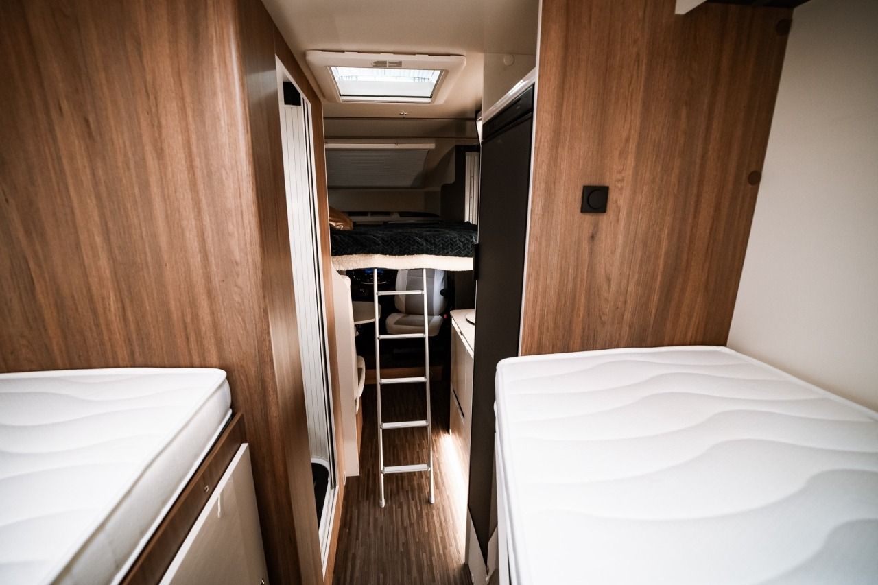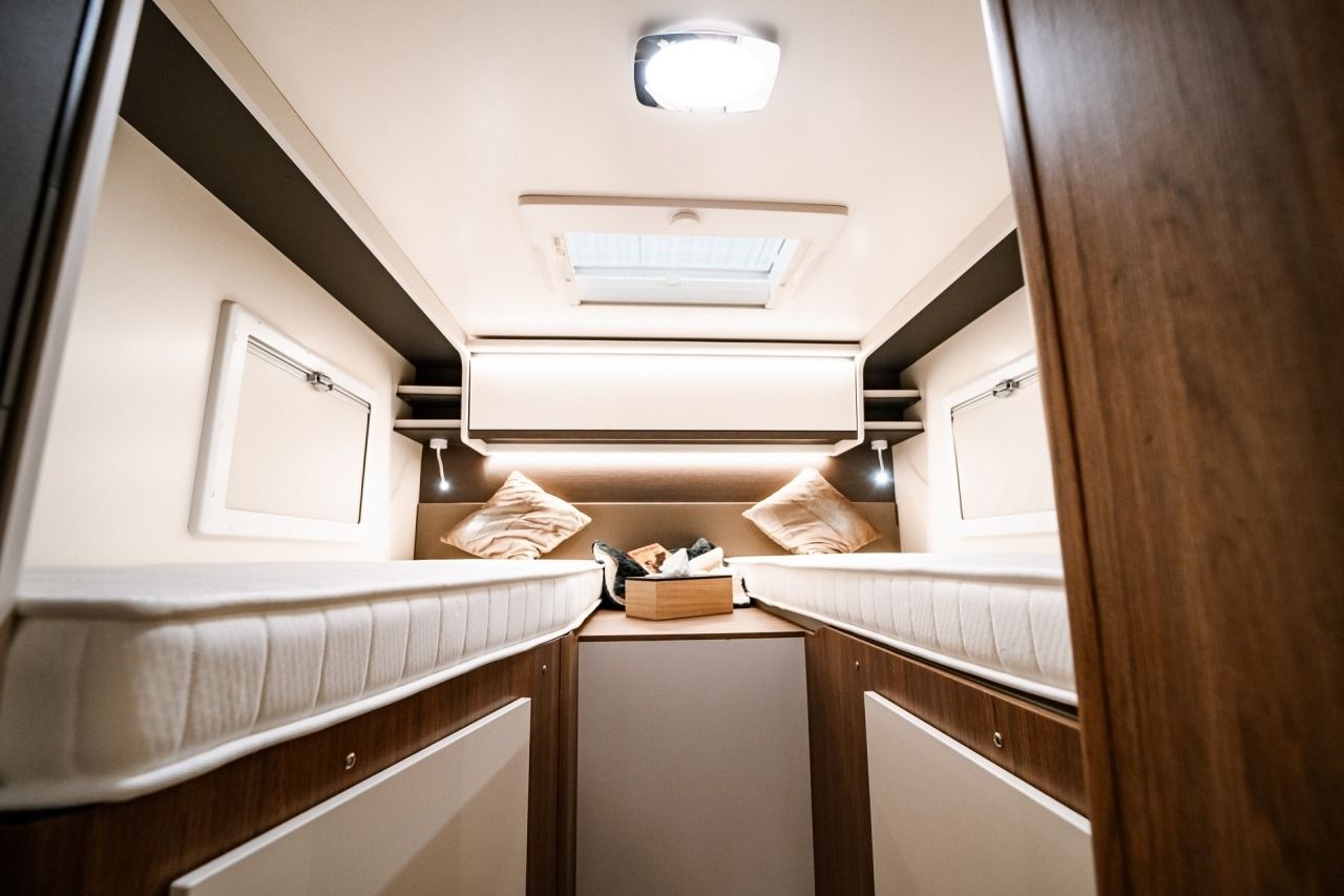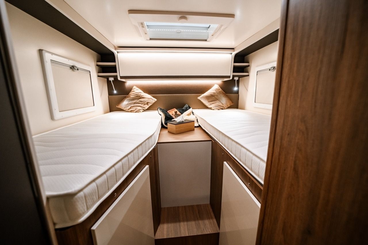 V zadní části vozu se nacházejí dvě oddělená lůžka o délce 2 metry. Lůžka lze spojit do manželského, pokud si přejete spát společně. V blízkosti jsou zásuvky USB, lampičky pro čtení a úložné skříňky nad postelí.