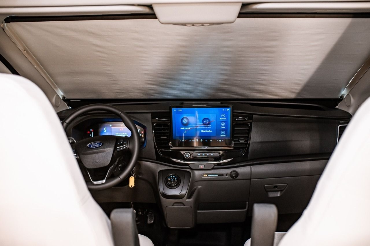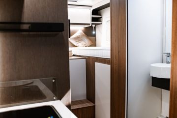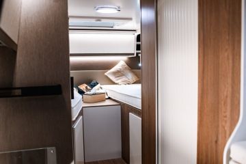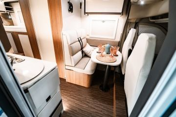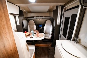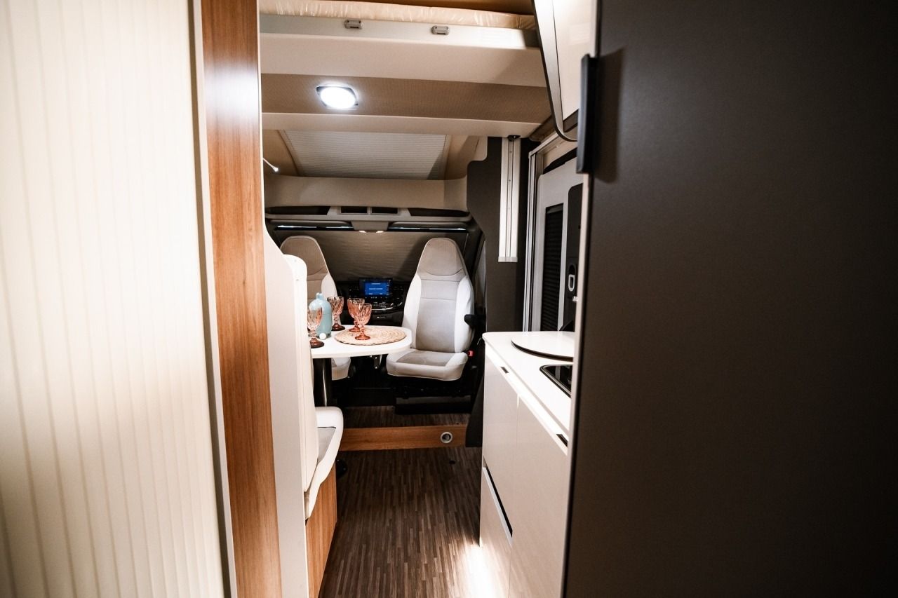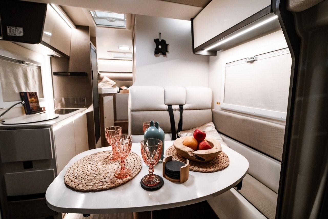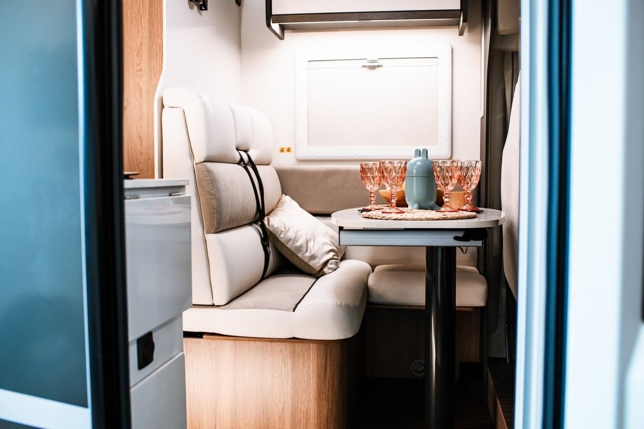 Interiér vozu nabízí jídelní kout ve tvaru L, přičemž stůl je pohyblivý, což zvyšuje variabilitu prostoru. Navíc lze jídelní kout přeměnit na lůžko pro jednu osobu.Prostor pro spaní