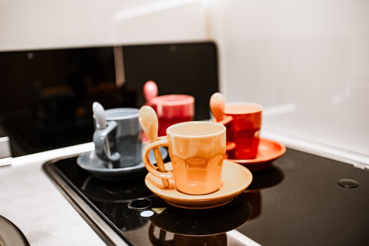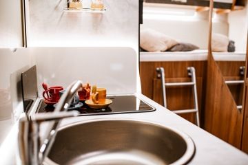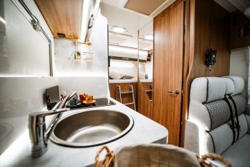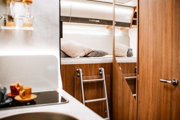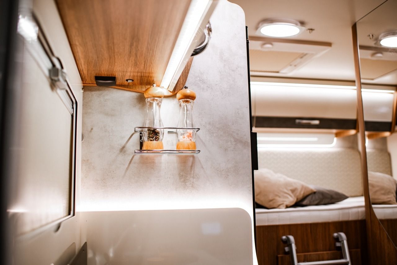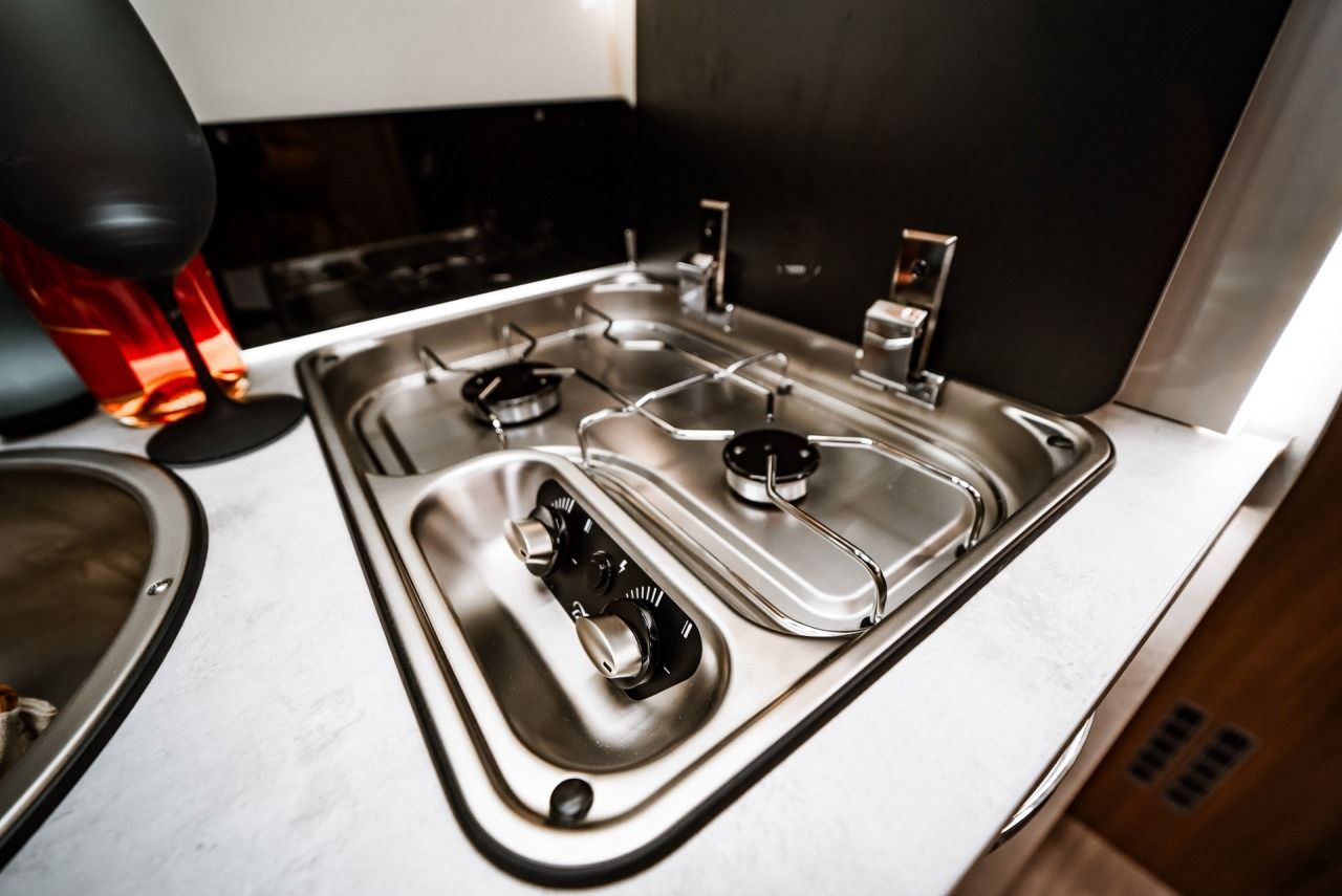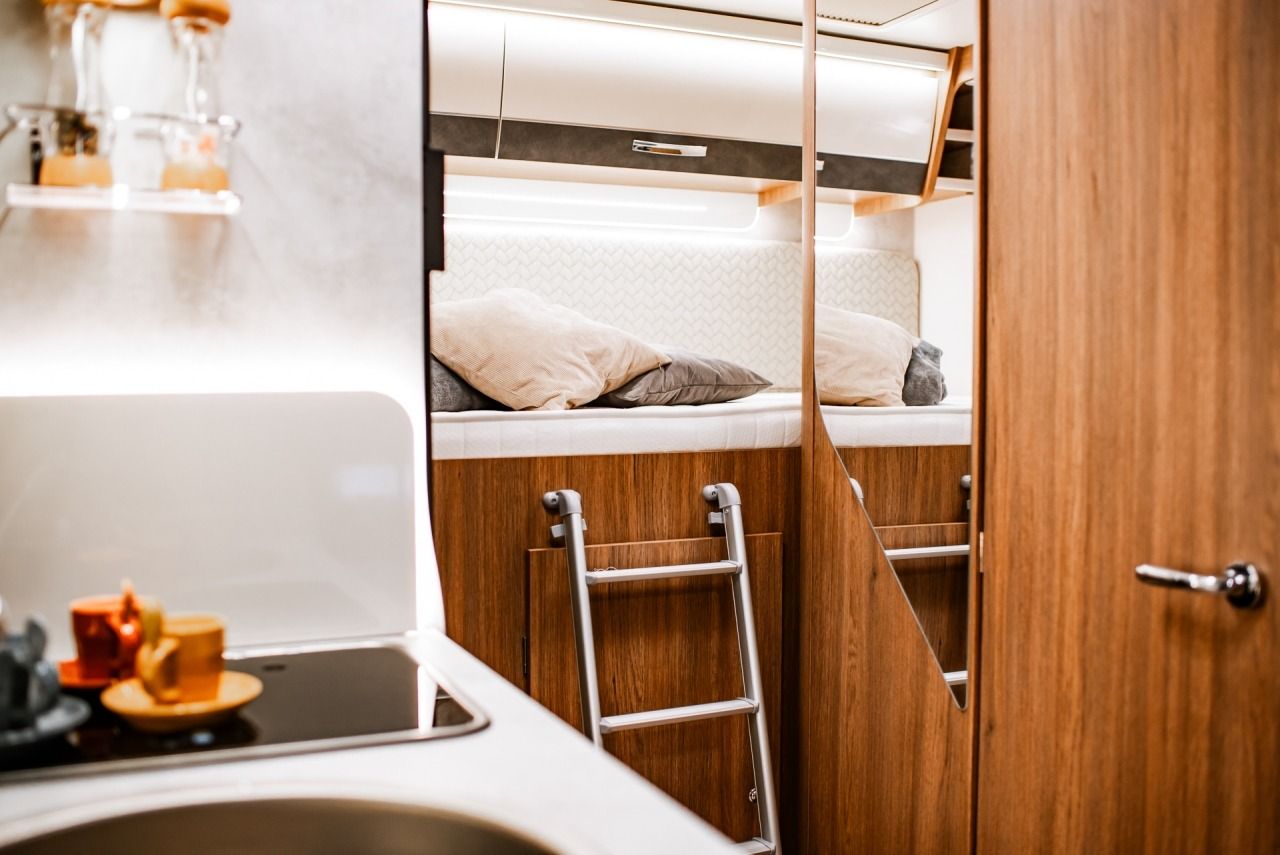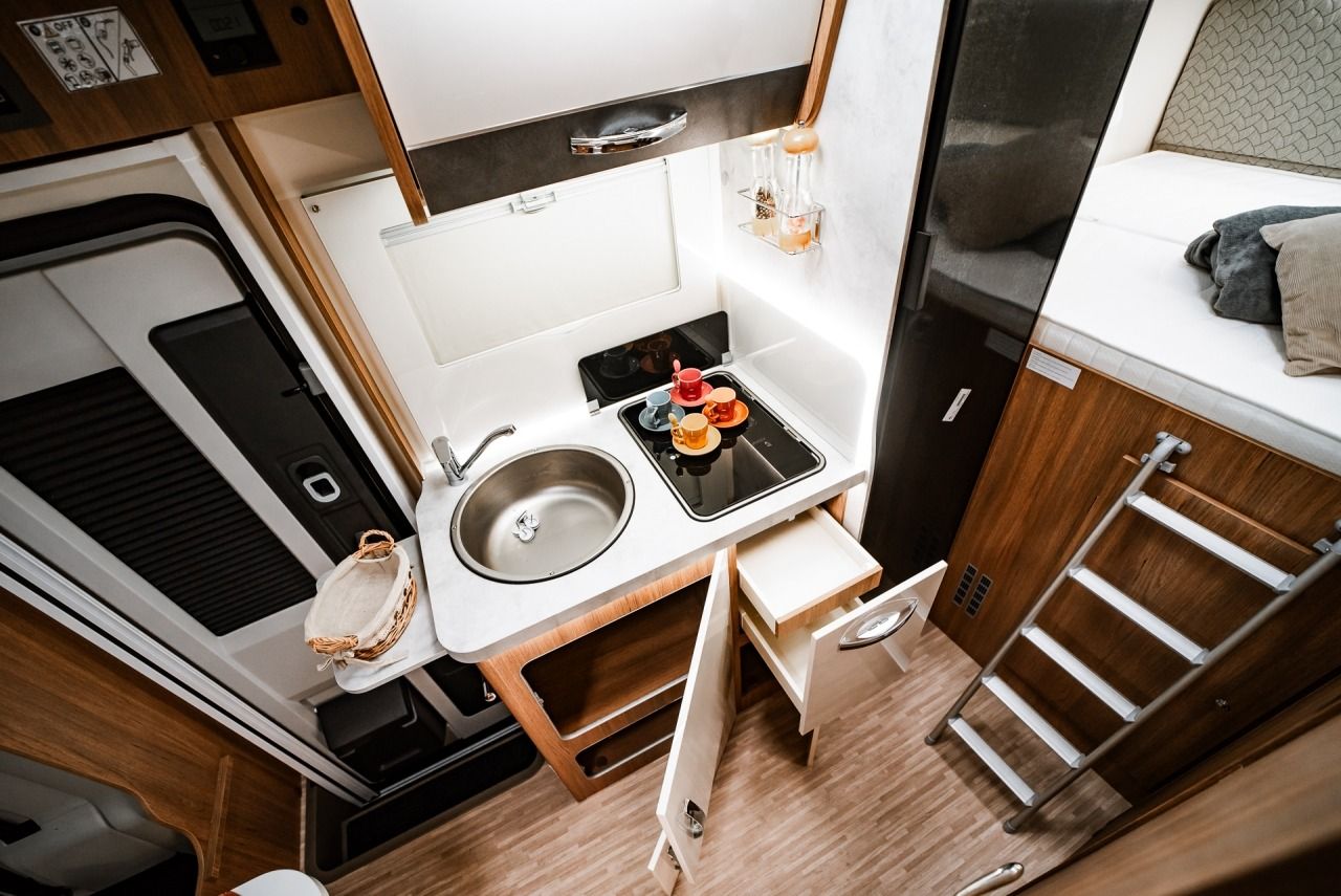 Kuchyně je elegantně pojata – saténově bílé horní skříňky kontrastují s tmavšími dekorativními prvky. Výbava zahrnuje dvouplotýnkový vařič, nerezový dřez, LED osvětlení pod pracovní deskou, velkou 137 l chladničku, horní úložné police a výsuvné detaily.