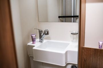 V koupelně je integrovaná sprcha, oddělená od prostoru WC skládacími dveřmi. Součástí je umyvadlo s úložnou skříňkou a zrcadlem.