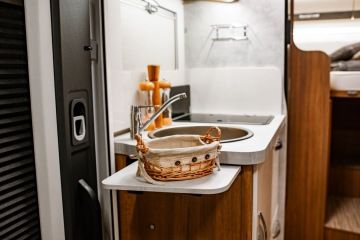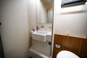 Koupelnový kout je navržen tak, aby poskytoval maximální flexibilitu v omezeném prostoru. Obsahuje oddělenou sprchu s pevnými skládacími dveřmi, umyvadlo, zrcadlo a úložné skříňky pro toaletní potřeby.